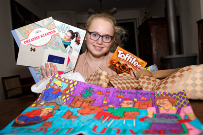 Een doosje Toffifee, een H&M-bon, een kleurboek (“Creatief kleuren zonder stress”), wat kleurpotloden en een Cosmo Girl: nogmaals gefeliciteerd Jasmijn!