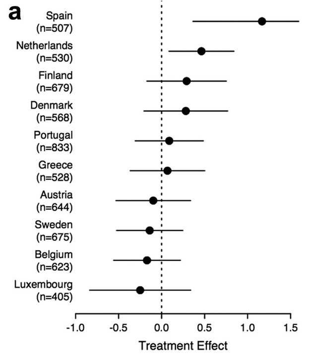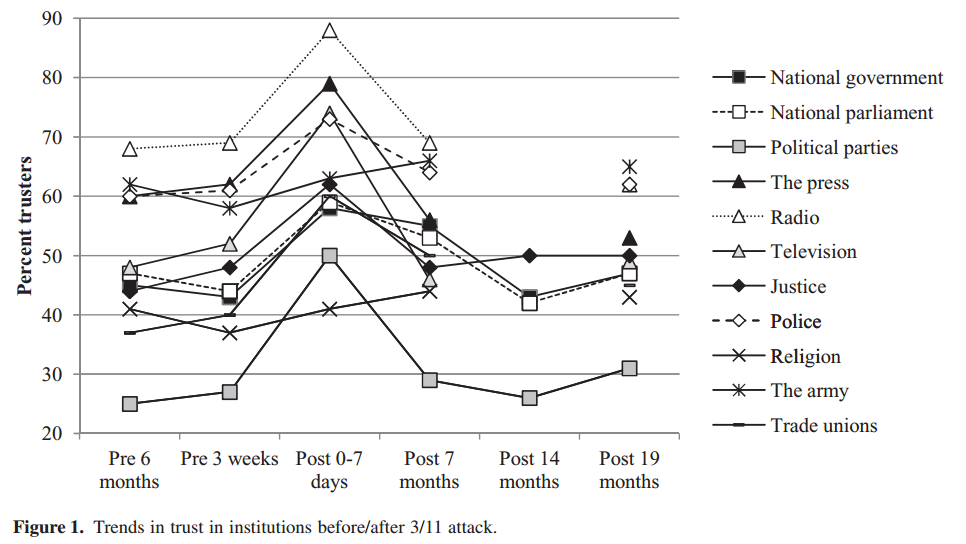 Collega’s uit Denemarken – Peter Thisted Dinesen en Mads Maier Jaeger – hebben hier echter een interessant alternatiefje op gevonden. Zij hebben uitgevlooid dat het veldwerk van de Eurobarometer in Spanje is uitgevoerd rond de aanslagen op Madrid op 11 maart 2004, nl. van 22 februari tot 18 maart. Daarnaast hebben de onderzoekers nog andere Eurobarometers toegevoegd (de golf ervoor en die erna) om toch maar zo goed als mogelijk longitudinale effecten te vangen. Uit hun analyse blijkt dat er wel zeker een “rally round the flag”-effect is – de rangen sluiten ten gevolge van terreur. Politieke instituties krijgen systematisch meer vertrouwen net na een terroristische aanslag, al blijkt ook dat deze effecten niet langdurig zijn. Onze vrienden van Stuk Rood Vlees hebben gelijkaardige maar kleinere effecten aangetoond in Nederland na de aanslag op de MH17.