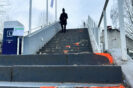 Oranje verf markeert slijtage aan de bibliotheektrap