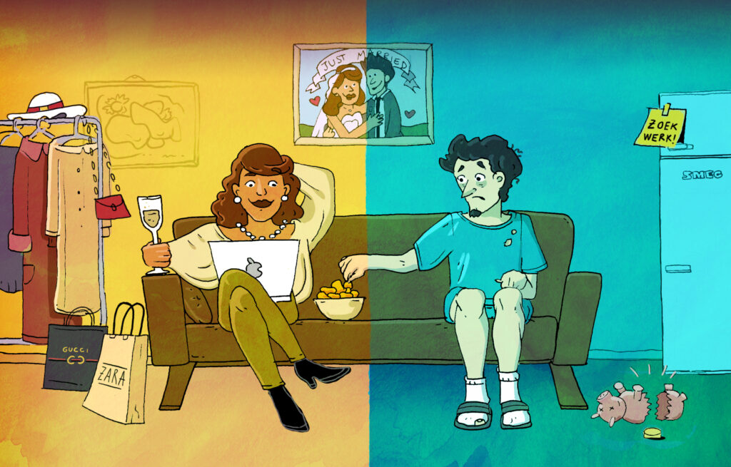 Theloudis: ‘Er bestaan ook tussenvormen, waarbij beide partners minder uitgeven, maar niet in gelijke mate.’ Dan gaat het stel bijvoorbeeld minder vaak uit eten maar koopt één partner alsnog regelmatig nieuwe kleding. De ander levert meer in door grote aankopen uit te stellen en scherp op elke euro te letten. Ze besparen samen, maar dragen de lasten ongelijk. ‘In economische termen zegt dit iets over het ‘relatiecontract’ en de toewijding aan een gezamenlijke toekomst.’