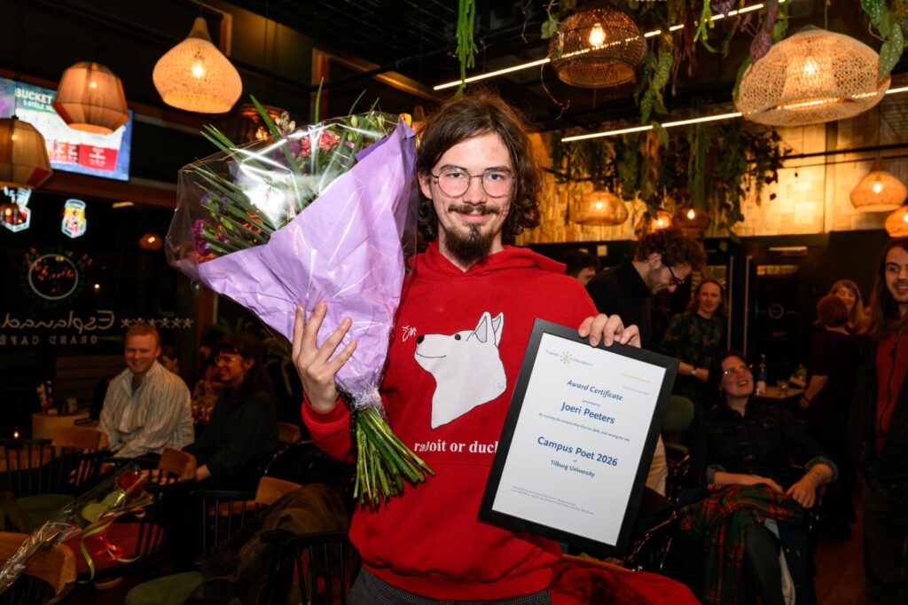 Het Esplanade-café op de campus van Tilburg University zit woensdagavond goed vol voor de 19e editie van de campusdichterverkiezing. Zes kandidaten dingen mee naar de titel, al moet één van hen verstek laten gaan en blijft haar bijdrage beperkt tot ingezonden werk. De jury wijst uiteindelijk Joeri Peeters (23) aan als winnaar. Hij volgt daarmee Max Verhaar op als campusdichter.