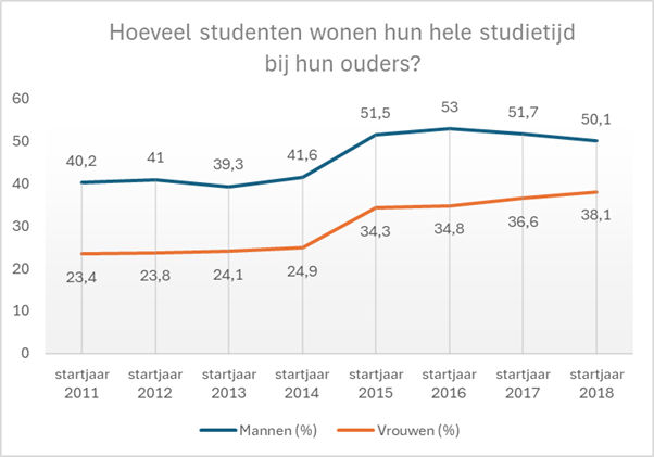 Voorheen woonde ongeveer 40 procent van de mannen hun hele studietijd thuis, opeens werd dat meer dan de helft. Bij vrouwen ging het van nog geen 25 procent naar 34 procent.