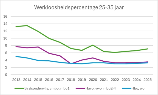 Jonge hoogopgeleiden (25- tot 35-jarigen) vonden het afgelopen jaar iets minder vaak werk: 3,3 procent was werkloos. In 2024 was dit 3,1 procent.