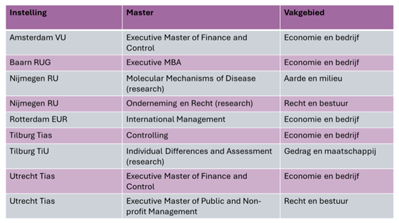 Volgens de Keuzegids zijn de best beoordeelde universitaire masters nog altijd vooral te vinden in de vakgebieden economie en bedrijfskunde. Ook enkele opleidingen binnen recht en bestuur krijgen een uitmuntende beoordeling.